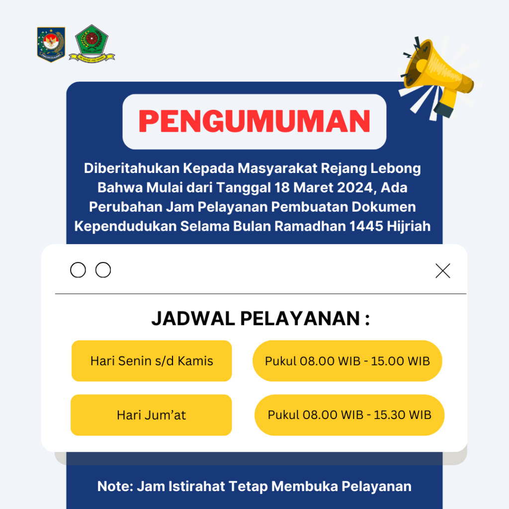 Diberitahukan kepada Masyarakat Rejang Lebong Bahwa Mulai dari tanggal 18 Maret 2024 Pelayanan Pembuatan Dokumen Kependudukan selama bulan Ramadhan 1445 Hijriah sbb: