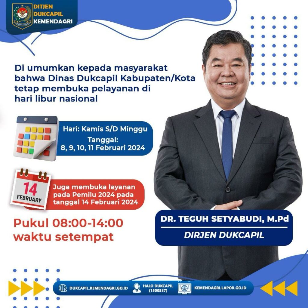 Di Beritahukan Kepada Masyarakat Rejang Lebong Bahwa Dinas Kependudukan dan Pencatatan Sipil Rejang Lebong tetap membuka Pelayanan di tanggal 8,9,10,11 dan 14 februari dari jam 08:00 sampai dengan 14 :00.